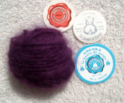Going through the closet looking for something else, a very-long-utterly-forgotten ziploc bag tumbled down in front of me, a close-out from a yarn store going out of business over a dozen years ago. It’s purple. Angora. I instantly recognized the tag in it: why on earth do the French use a sketch of the rear end rather than the face of the bunny? (No, wait. Please. Do not answer that.) You got it–my very own Boule de Neige. Ten skeins’ worth! Too funny.