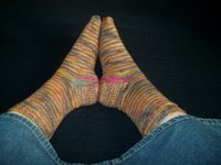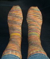 And inside was this gorgeous pair of Koigu handpainted-yarn socks. Made as if she’d measured them to my feet as she’d knitted along. Wow. If I could make everybody’s feet feel like mine feel like right now with these on, nobody would ever again ask why anybody would bother to handknit socks. Wow.