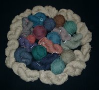 I have made three afghans with it so far. My mother knitted some into an exceedingly elegant aran sweater. And I have five pounds, half of it dyed into all these colors (we are still working on the camera thing), all waiting to be made up into the next afghan; I’m picturing a windowpane quilting pattern or some such, the undyed skeins framing the blocks of color.
