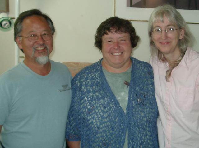 Meantime, (this is a picture from last summer, sorry I don’t have a newer one, Kris is wearing her Water Turtles shawl) yesterday I got to see Mel and Kris at a show in San Jose–I only went because they were there. You know, pottering around a little bit here and there but mostly spending my time catching up with them; I went in the afternoon when the crowds had died down quite a bit so we could visit and not have me be in the way.