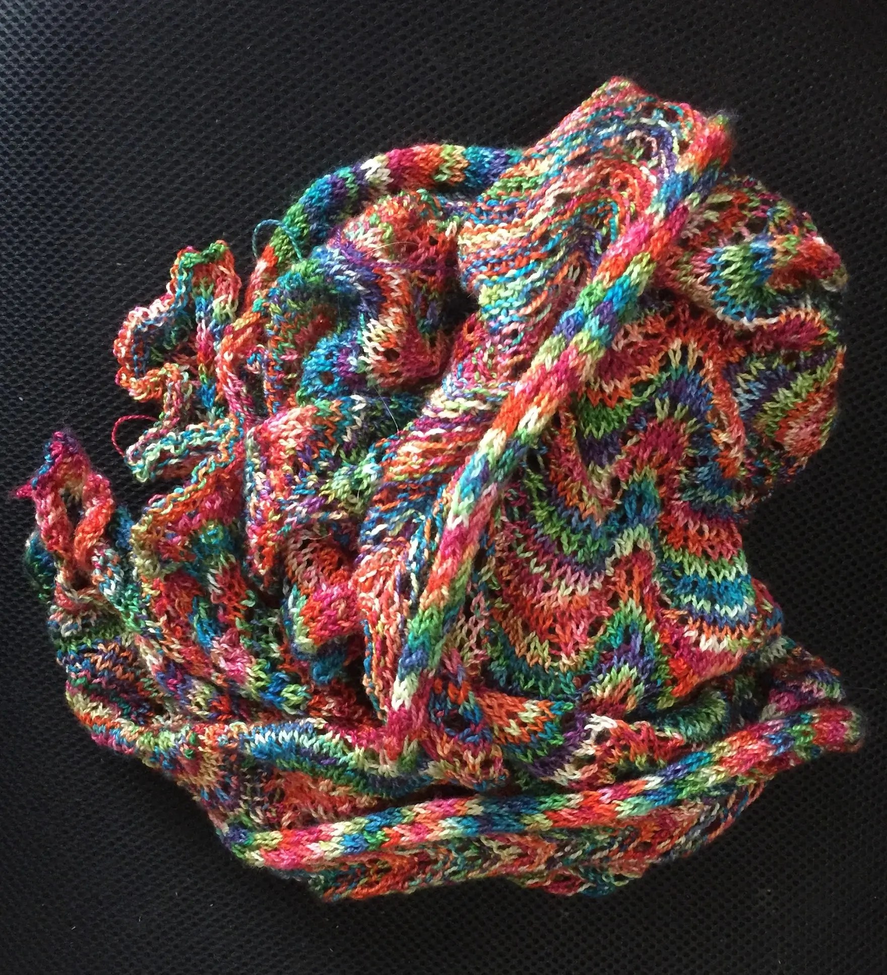 I didn’t run the end in because I didn’t cut it off because I wanted to have the option of trying it on again and maybe adding just a few last repeats. Again. But at about 16×76″, I think that’ll do.