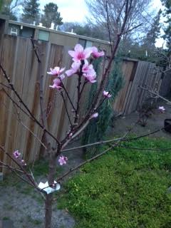 Meantime, after a few days of unseasonably warm weather, 79F today when the average for 2/16 is 61F, this peach and my Santa Rosa plum went full speed ahead. I just hope the bees get to those flowers by Wednesday afternoon because we’re supposed to have a good hard rain then and on into Thursday, stopping (they say) a few hours before the doors open at the Santa Clara Convention Center for the people doing classes.