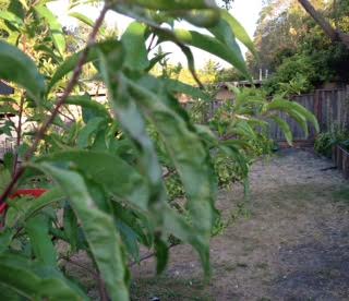 That peach shading went on for as much as an hour and a half in the early afternoon in June–there has been no flowering under that direct shade line. I told them I certainly have no say regarding their trees in their yard and wouldn’t expect to, but on items on a fence that I own too? That, I do. I commit my water towards future fruit and I had a problem.